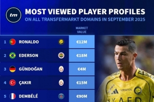 德轉(zhuǎn)球員頁面9月瀏覽量排名:C羅居首,埃德森第二、梅西第七