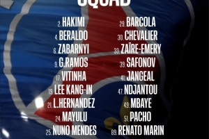 后衛:2-阿什拉夫、4-貝拉爾多、6-扎巴爾尼、21-盧卡斯-埃爾南德斯、25-努諾-門德斯、51-帕喬