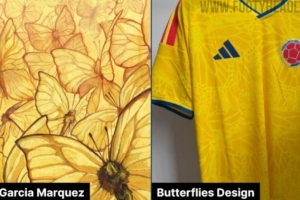 哥倫比亞世界杯主場球衣的獨特之處在于其蝴蝶圖案,以此向哥倫比亞作家馬爾克斯致敬,象征著希望、變革和愛的黃色蝴蝶在他的作品中頻繁出現。