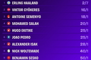 英超金靴賠率:哈蘭德僅2/7為最大熱門,約克雷斯16/1位居次席