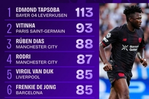 體育資訊9月19日訊 歐冠首輪今日全部戰罷,據Squawka的數據統計,勒沃庫森后衛塔普索巴完成113次傳球,傳球準確率93%,另外他是本輪唯一完成傳球次數100+的球員。