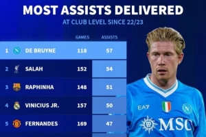 近3年俱樂部各項賽事總助攻榜:德布勞內仍居首,薩拉赫、B費在列