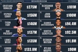 世界收入最高運動員:C羅2.75億斷檔第1&庫里1.56億第2 詹姆斯第6