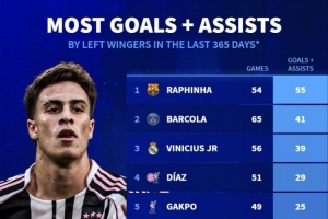 五大聯賽左邊鋒近一年參與進球:拉菲尼亞55球最多,伊爾迪茲第六