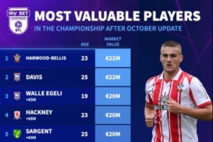 英冠最新身價前十:貝利斯、戴維斯2200萬歐居首,伊鎮4人在列