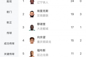 體育資訊10月6日訊 中甲聯賽25輪戰罷,射手榜方面,本輪雙響的姆本扎24球領跑,本輪分別進球的埃里克斯和向余望分居第二和第四位。