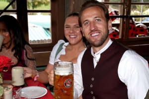 凱恩說道:“上周日我們參加了慕尼黑啤酒節。我只喝了一杯啤酒——用那種大杯子裝的,一杯就夠了?!?/p>