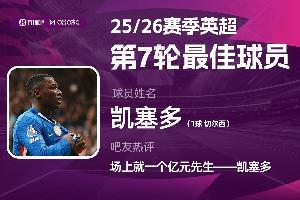 2025-2026賽季英超火熱進行中,體育資訊和咪咕體育聯合發起每輪英超最佳球員評選活動!第7輪評選結果出爐,切爾西后腰凱塞多攻防兼備,轟入世界波幫助切爾西2-1戰勝利物浦,獲得吧友5.6萬票的支持,當選 【體育資訊X咪咕體育英超第7輪最佳球員】!