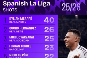 西甲射門(mén)次數(shù)排行:姆巴佩40次居首 費(fèi)蘭-托雷斯第四、亞馬爾第八