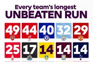 排在槍手紀錄之后的是曾44場不敗的利物浦和40場不敗的切爾西。