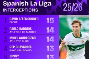 體育資訊10月7日訊 日前,Squawka統計了本賽季西甲攔截次數排行,巴里奧斯14次并列第2,瓊阿梅尼12次并列第6。