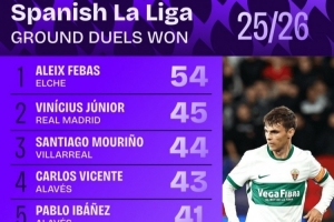體育資訊10月7日訊 日前,Squawka統(tǒng)計(jì)了本賽季西甲地面拼搶成功次數(shù)排行,維尼修斯45次第二,姆巴佩40次第七。