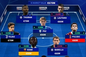 中場:伊爾迪茲(尤文圖斯,7500萬歐元)、帕斯(科莫,5500萬歐元)、普利西奇(AC米蘭,6000萬歐元)、科內(羅馬,5000萬歐元)、巴雷拉(國際米蘭,6500萬歐元)