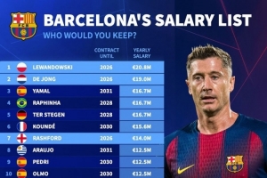 德轉列巴薩年薪榜:萊萬2080萬歐居首,德容1900萬歐次席