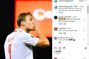 霍伊倫社媒曬出比賽照片,慶祝球隊取勝,配文:“我們遠征客場,享受比賽,轟入6球,拿下勝利并領跑小組!太美妙了。”