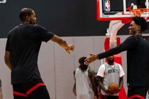 火箭官方曬今日訓練照:KD阿門擊掌慶祝 奧科吉秀霸王舉鼎暴扣