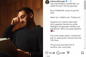 恰爾汗奧盧達成國家隊出戰100場里程碑,他在社交媒體上寫道:“從在街頭追逐足球,到身披星月戰袍(土耳其隊球衣)出戰百場。這段旅程充滿了犧牲、熱愛與驕傲。為我的家人,為我的祖國,為土耳其?!?/p>