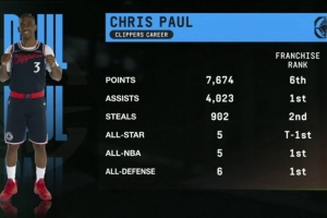 在快船效力期間,保羅共得到7674分(隊史第6),送出4023次助攻(隊史第1),完成902次搶斷(隊史第2),5次入選全明星(并列隊史第1),5次入選最佳陣容(隊史第1),6次入選最佳防守陣容(隊史第1)