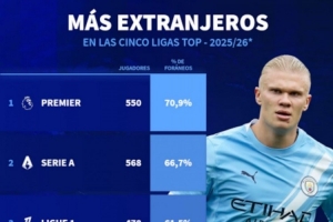 五大聯賽外籍球員占比:英超70.9%最高,西甲43.3%最低