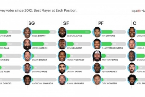 體育資訊10月14日訊 今日,NBA數(shù)據(jù)專家Todd Whitehead統(tǒng)計了自從2002年以來聯(lián)盟總經(jīng)理調(diào)查投票對于“各個位置最佳球員”的得票最多球員。