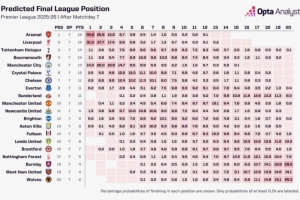 此外奪冠概率最高的是切爾西的2.6%。熱刺1.1%,曼聯為0%。