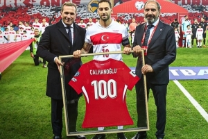 恰爾汗奧盧在對陣保加利亞的比賽中達成國家隊出戰(zhàn)100場里程碑,此役賽前土耳其隊向他頒發(fā)了紀念球衣。