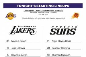 湖人vs太陽先發出爐:東契奇&斯瑪特賽季首秀!東艾首次搭檔