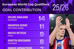 本屆歐洲世預賽參與進球榜:哈蘭德14球居首,德佩11球次席