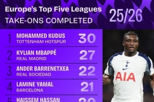 體育資訊10月17日訊 根據本賽季歐洲五大聯賽的數據統計,熱刺球員庫杜斯以30次成功過人領跑該項數據榜,皇馬前鋒姆巴佩以27次緊隨其后。