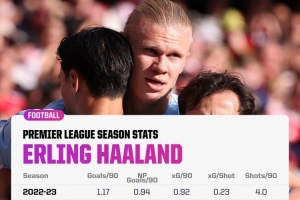 哈蘭德本賽季每90分鐘射門4.4次、進1.36球,均創英超生涯新高
