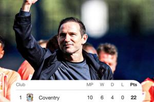 蘭帕德的球隊近4場比賽豪取4連勝且1球沒丟,4場一共打入14球:3-0伯明翰、4-0米爾沃爾、5-0謝菲爾德星期三、2-0布萊克本。目前6勝4平的考文垂以22分力壓米德爾斯堡,領(lǐng)跑英冠。