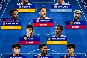 中場:維尼修斯(皇馬,1.5億歐)、佩德里(巴薩,1.4億歐)、穆西亞拉(拜仁,1.4億歐)、貝林厄姆(皇馬,1.8億歐)、亞馬爾(巴薩,2億歐)