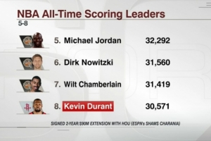 杜蘭特在NBA職業生涯總得分榜上排名第八(30571),若按照上賽季場均得分(26.6分),只需要65場比賽,他將超越邁克爾-喬丹(32292)。