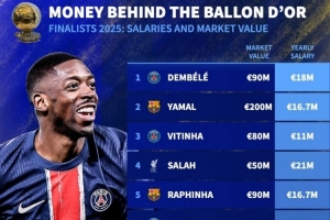 體育資訊9月23日訊 德國轉會市場盤點了2025年金球獎排名前10球員的年薪,姆巴佩3130萬歐居首,金球獎得主登貝萊1800萬歐。