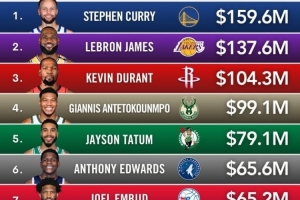 本年度球星收入排行:庫里1.596億居首 詹姆斯1.376億居次 KD第三