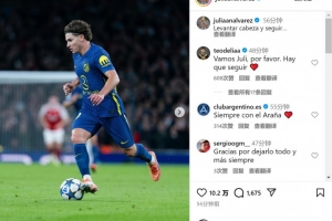 馬競前鋒阿爾瓦雷斯此役踢滿全場,賽后他在社交媒體上曬出比賽照片,配文:“抬起頭,繼續前進。”
