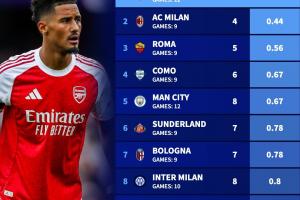 最強防線??阿森納12場僅丟3球五大聯賽最少,米蘭9場丟4球第二