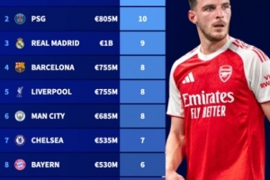 體育資訊10月23日訊 德國轉會市場更新了五大聯賽球員的最新身價,全球身價前100名的球員中,阿森納和巴黎圣日耳曼均有10人,兩隊可以說囤積了非常多的天才球員。