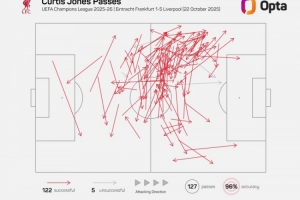 此役柯蒂斯-瓊斯為利物浦踢滿全場,成功傳球122次,這是2003-2004賽季Opta統計相關數據以來,利物浦球員歐冠單場成功傳球紀錄。