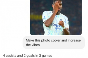 賽后國米官推曬出用ChatGPT整活的照片,他們將博尼慶祝的照片發給AI要其修圖,并注明要把圖片變得更酷,氛圍感拉起來,AI答復道:“3場比賽2球4助攻,沒法更嗨了。”