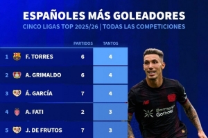本賽季五大聯賽西班牙球員進球榜:費蘭、格里馬爾多6場4球居首
