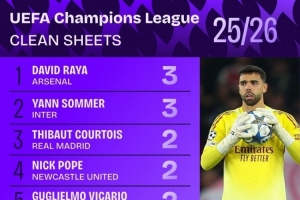 本賽季歐冠零封榜:拉亞、索默3場最多,庫爾圖瓦、維卡里奧2場
