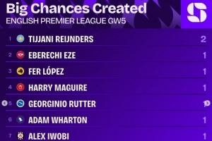 體育資訊9月24日訊 英超第5輪戰罷,squawkafootball列各項數據排行,賴因德斯共創造2次重大機會,本輪最多。