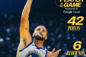全場比賽庫里25中14、其中三分12中6,轟下42分6板7助1帽,下半場28分,包括關(guān)鍵時(shí)刻連得球隊(duì)的16分。