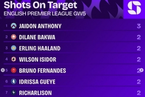 英超第5輪射正榜:杰頓-安東尼3次居首,哈蘭德等9名球員兩次