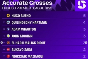 英超第5輪精準傳中榜:烏戈-布埃諾5次居首,哈特曼4次第二