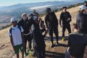 體育資訊9月24日訊 外媒曬出一張俄勒岡大學男籃隊員爬山照,中國球員林葳在列,穿上了統一的服裝,上腳科比4耐高配色(耐克總部在俄勒岡州,耐克是俄勒岡大學的長期贊助商)。