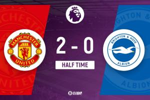 上半場傷停補時1分鐘,半場結束,曼聯暫2-0布萊頓。