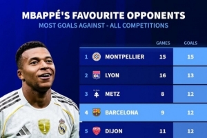 體育資訊10月27日訊 皇馬在本輪西甲焦點戰2-1力克巴薩,姆巴佩取得進球。《轉會市場》統計顯示,巴薩也是姆巴佩生涯各項賽事進球第4多的對手。