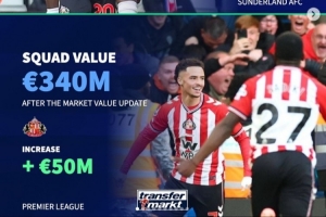 各大聯賽身價漲/跌最多隊:桑德蘭、科莫大幅上漲,曼城-2千萬